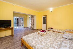 Уютный, ухоженный жилой дом ( офрмлен как квартира ), 5 раздельных комнат, которые можно использовать как для постоянного проживания, так и для приема отдыхающих. Комнаты площадью 20,5, 14, 14, 10,4, 9 м кв, в каждой комнате совмещенный санузел. В комнатах вся необходимая мебель, техника, установлены кондиционеры. Большое помещение, расположенное на терассе, используется как столовая, оборудована столами, стульями и холодидьником.В цокольном помещении 3 кухни с мебелью, холодидьниками и кондиционерами. Газовые плиты , газ балонный. В подвале оборудована запасная металлическая емкость для воды.Дом использовался как гостинный для приема отдыхающих, есть свои клиенты, которые приезжают отдыхать ежегодно. Земельный участок 3 сотки выделен в собственность по соглашению собственников( общедолевая собственность жильцов дома). Документы РФ, один собственн Продается в связи с переездом.