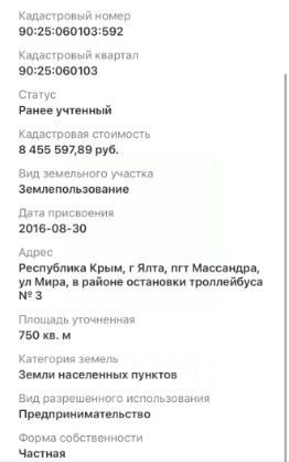 К продаже предлагается исключительный участок, таких уже не осталось. Так как в таких местах плотная застройка и кадждый м2 имеет значение.Участок находится в зоне элитной коттеджной и отельной застройки. С участка открывается великолепный вид на морское побережье Ялты и гряду гор. До пляжа от участка пешком 5 минут. ____________Расположение: Крым, г. Ялта, Массандра, ул. Мориса ТерезыПлощадь:18 соток Категория земель: земли населенных пунктовВид разрешенного использования:индивидуальное жилищное строительствоПраво устанавливающий документ:Право зарегистрировано .Существующие ограничения(обременения права)-не зарегистрированоКадастровый паспорт земельного участка -естьКоммуникации: Водоснабжение-есть/Электричество-есть/Канализация -есть/Газ-естьКоммуникации располагаются в пределах населенного пункта, допускающегостроительство частного жилого дома или объекта инфраструктуры. Для более конкретного определения точек подключение, необходимо взять технические условия в государственных унитарных предприятиях по г. Ялта.Характерные особенности земельного участка :Вид с участка на горы Близость к морю 250м Подъезд -асфальтированная дорога/грунтовая Форма участка - правильная Рельеф ровный, умеренный уклон. Инфраструктура - развитая (рестораны, банк. отделения, магазины, аквапарки , школы, остановки в пределах 100м-1. 500м)Дополнительное описание:Климат -субтропический , средиземноморского типа .Пляжи -открытые , мелкогалечные с прозрачной бирюзовой водой.Востребовано-место привлекательно для людей желающих развить отельный бизнес. Южный берег Крыма -это центр всей туристической инфраструктуры полуострова-дворцы, имения, замки, парки, гроты, бухты, канатные дороги , безупречные пляжи.