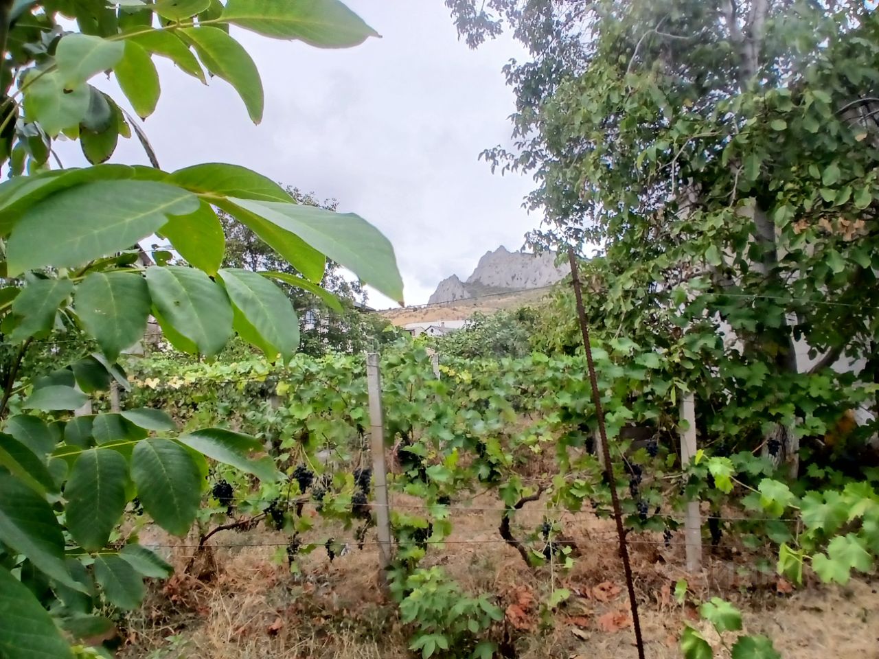 Небольшой ровный участок 5,3 сот под Кара-дагом (250 м от заповедника). Удобный подъезд, хорошая дорога. Все коммуникации - свет и центральное водоснабжение на участке, газ - по границе участка. На участке есть оформленный домик 18 кв.м. (жилая комната, санузел, кухня), а также благоустроенный вагончик для летнего проживания. Терраса для отдыха. На участке много плодоносящего винограда. Все соседи постоянно проживают.