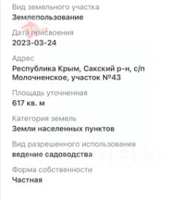Продается участок 6 соток ИЖС в 2,5 км от моря, в 10 км от города Евпатория.Участок ровной прямоугольной формы.Все коммуникации: газ, свет, централизованное водоснабжение, проходят рядом с участком.Расположение участка идеально для постоянного проживания и сдачи в аренду в сезон.Участок расположен в с.Молочное с развитой инфраструктурой: магазины, медицинский пункт, школа, детский сад.До моря прямая асфальтированная дорога. В селе строятся дороги, современные дома и жилые комплексы.Торга нет.Возможно оформление в ипотеку.1 собственник. МЫ ГАРАНТИРУЕМ ФИНАНСОВУЮ БЕЗОПАСНОСТЬ ДЛЯ НАШИХ КЛИЕНТОВ.Полное юридическое сопровождение сделки.Высокий шанс одобрения ипотеки.Звоните, с удовольствием ответим на ваши вопросы!Код пользователя: 104983Номер в базе: 3242378