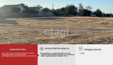 Земельный участок в центре п.г.т. Раздольное в Крыму. Категория: Земли населенных пунктов.Почтовый переулок д.5Назначение: индивидуальное жилищное строительство. Площадь 7 (Семь) соток.На участок подведена вода (документально узаконена) и электричество 380 Вольт.Газ от участка в одном метре от его границы.Участок полностью огорожен наборным еврозабором на ленточном фундаменте, высота забора 2 (Два) метра.Капитальные въездные ворота и калитка из металла.На участке залит фундамент под строительство дома размером 12Х12 метров с заглублением на 1,5 метра шириной 50 сантиметров. На фундаменте возведен армированный цоколь высотой в 50 сантиметров и шириной 40 см.Место тихое, практически тупик, машины не шумят, до центра поселка пешком около 5 минут прогулочным шагом. Вся необходимая для жизни социальная, банковская, торговая и культурная инфраструктура в шаговой доступности. Идеальный асфальтированный подъезд.До ближайшего берега моря 9 км. (село Портовое), Бакальская коса в 20 километрах.3 200 000 (три миллиона двести тысяч ) рублей.Собственник.