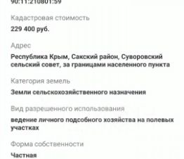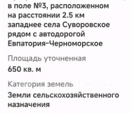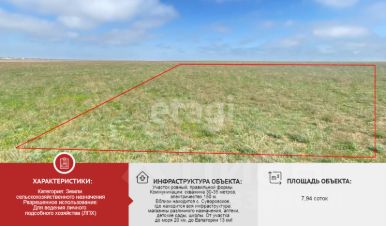 Продается участок, площадью 7,94 сот возле с. Суворовское.Категория земель: Земли сельскохозяйственного назначения. Вид разрешенного использования: Ведение личного подсобного хозяйства на полевых участках.Участок ровный, правильной формы. Коммуникации: скважина 30-35 метров, электричество 150 м.Вблизи находится с. Суворовское, где находится вся инфраструктура: магазины различного назначения, аптеки, детские сады, школы. От участка до моря 20 км, до Евпатории 13 км!Звоните! МЫ ГАРАНТИРУЕМ ФИНАНСОВУЮ БЕЗОПАСНОСТЬ ДЛЯ НАШИХ КЛИЕНТОВ.Полное юридическое сопровождение сделки.Высокий шанс одобрения ипотеки.Звоните, с удовольствием ответим на ваши вопросы!Код пользователя: 167729Номер в базе: 7865556