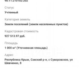 Предлагаем вашему вниманию уникальный участок земли в живописном Сакском районе Республики Крым. Адрес: ул. Шевченко, 8, с. Суворовское. Этот участок площадью 10 соток с юридическим статусом ИЖС (индивидуальное жилищное строительство) является отличной возможностью для строительства вашего идеального дома на Черноморском побережье. Участок располагается в спокойном и зеленом районе, окружённом природной красотой полуострова. С удобным доступом к центральному водоснабжению, вы сможете обеспечить свой будущий дом всем необходимым. Также предусмотрено возможное подключение к электричеству и газоснабжению, что делает данный участок ещё более привлекательным для строительства. . Это ваш шанс создать уникальное пространство для жизни вдали от городской суеты, наслаждаясь свежим воздухом и тишиной. Суворовское — это место, где гармонично сочетаются природа и возможность комфортного проживания. Не упустите свой шанс — звоните и записывайтесь на просмотр уже сегодня!