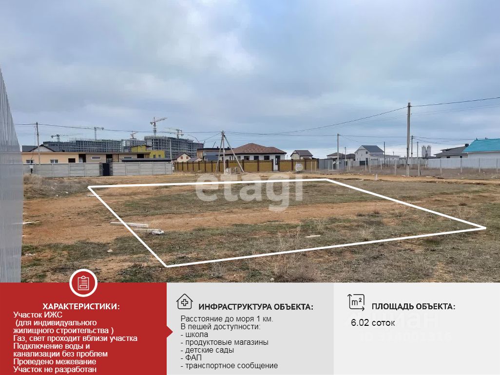 Продается земельный участок 6.02 соток село Уютное. От Евпатории 4 км! В 1.5 км от моря. Категория земель: Земли населенных пунктов. Разрешённое использование: Для индивидуального жилищного строительства. Участок ровный, правильной формы без уклона. По границе участка проходит линия электропередачи, интернет, водопровод и канализация. Дорога отсыпана щебнем. До асфальтной дороги 300метров Право собственности РФ, проведено межевание. Оформление через МФЦ (договор купли-продажи). В населенном пункте развита инфраструктура: магазины, аптеки, школа, детский сад, автобусная остановка, спортивные площадки и школа зимних видов спорта ''Наследие'' Ильи Авербуха. Звоните, отвечу на интересующие вопросы МЫ ГАРАНТИРУЕМ ФИНАНСОВУЮ БЕЗОПАСНОСТЬ ДЛЯ НАШИХ КЛИЕНТОВ. Полное юридическое сопровождение сделки. Высокий шанс одобрения ипотеки. Звоните, с удовольствием ответим на ваши вопросы! Код пользователя: 172459 Номер в базе: 4432621