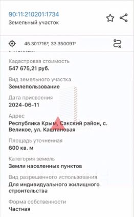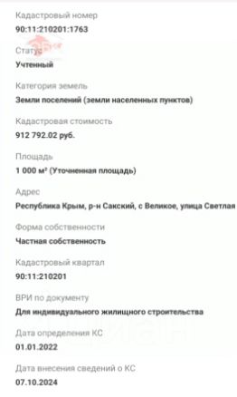Объект 1498. Продается уникальный земельный участок площадью 9 соток, расположенный в живописном поселке Великое, Сакского района Республики Крым. Этот участок с категорией земель - земли населенных пунктов предназначен для индивидуального жилищного строительства, что открывает великолепные возможности для создания вашего идеального дома или дачи в одном из самых красивых регионов страны.Участок находится всего в 11 км от города Евпатории, до которого вы сможете добраться по новой трассе всего за 15 минут. Это идеальное место для тех, кто ценит спокойствие и единение с природой, но не хочет отказываться от комфортной городской жизни. До моря всего 12 км, что дает возможность наслаждаться всеми прелестями курортного отдыха в любое время.Инфраструктура поселка полностью развита — рядом находятся магазины, кафе и другие объекты, необходимые для комфортного проживания. Также предусмотрено возможность подключения электричества, газа и централизованной воды, что значительно упрощает процесс застройки и проживания. Документы Российской Федерации уже готовы к сделке, что позволяет быстро и без лишних хлопот оформить покупку. Возможен оперативный показ участка — не упустите шанс стать владельцем этого прекрасного земельного участка!