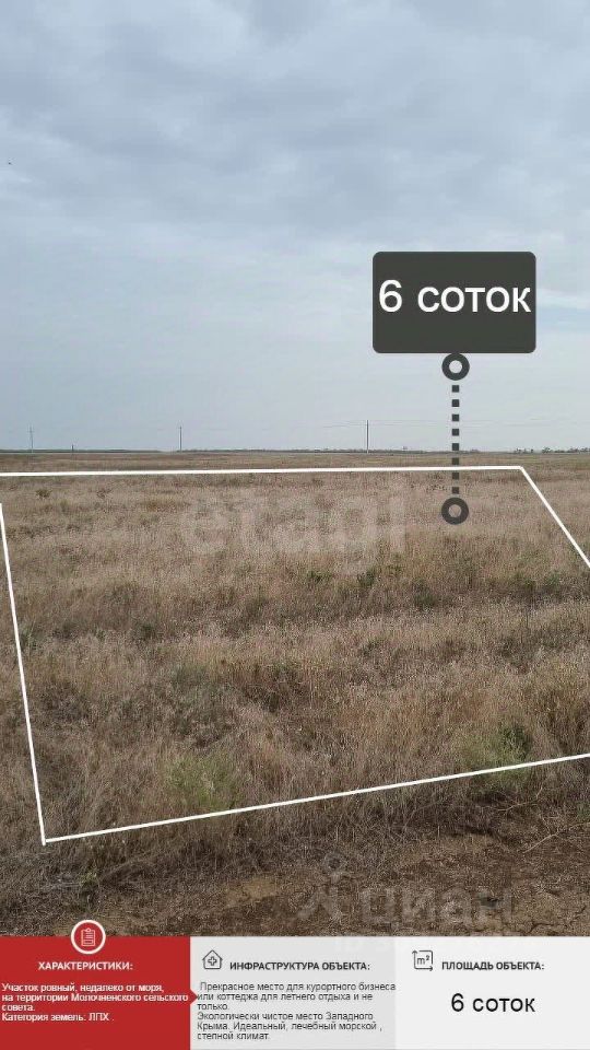 Продается участок 6 соток ЛПХ в Молочненское сельское поселение, Сакский район, Республика Крым рядом с Евпаторией, ровный, недалеко от моря, на территории Молочненского сельского совета. Категория земель: ЛПХ . Разрешённое использование: Ведение личного подсобного хозяйства на полевых участках. Участок ровный, правильной формы. Право собственности РФ. Оформление через МФЦ (договор купли-продажи). Недалеко от Черного моря! Море в этих местах входит в ТОП мест Крыма с самой чистой и прозрачной водой и белым песком. Государственный акт на землю, участок в собственности. Документы РФ готовы. Прекрасное место для курортного бизнеса или коттеджа для летнего отдыха и не только. Экологически чистое место Западного Крыма. Идеальный, лечебный морской , степной климат. Звоните с удовольствием отвечу на все вопросы, проведу показ. МЫ ГАРАНТИРУЕМ ФИНАНСОВУЮ БЕЗОПАСНОСТЬ ДЛЯ НАШИХ КЛИЕНТОВ. Полное юридическое сопровождение сделки. Высокий шанс одобрения ипотеки. Звоните, с удовольствием ответим на ваши вопросы! Код пользователя: 195254 Номер в базе: 3301757