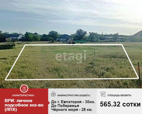 Продается земельный участок 6,11 соток в с. Уютное, от Евпатории 2 км. Назначение земли: Земли населенных пунктов. Категория земель Земли населенных пунктов Вид разрешенного использования ведение личного подсобного хозяйства на полевых участках Форма собственности Частная Участок имеет трапециевидную форму, с удобной уличной стороной. Соседи построились и живут. Коммуникации: свет, вода. Газ уже подведен. Инфраструктура: до песчаного пляжа и лазурного моря 3 км., в селе есть новый детский сад, современная школа, ледовый дворец, магазины и мн. др. Звоните, покажу в удобное для Вас время!