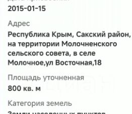 Участок в с.Молочное 6,83 сот. ''ЭКОсад'' Категория земель: Земли сельскохозяйственного назначения. Разрешенное использование: Ведение личного подсобного хозяйства на полевых участках. Проект Эко сад, находиться между Евпаторией и Молочное. Свет будет через 3 месяца, тянут новую линию. Приглашаем на просмотр! Звоните прямо сейчас! Всем добра! Хороших покупок и продаж!