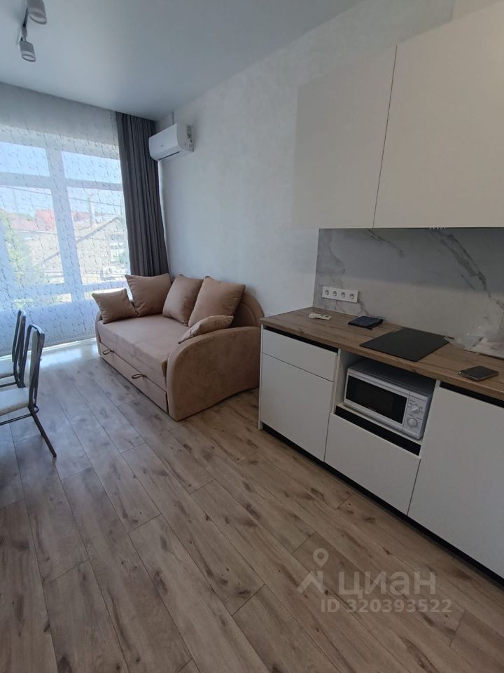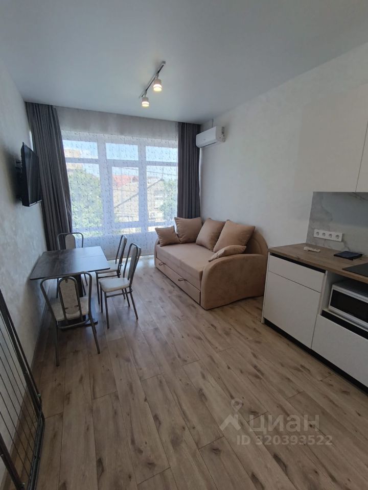 Сдаётся уютная студия с евроремонтом в Симферополе на Общественной улице, 27. Квартира в современном доме всего на три этажа, находится на втором этаже. Общая площадь — 26 кв. м, жилая — 12 кв. м, площадь кухни — 5 кв. м. Окна выходят во двор, поэтому в квартире тихо и спокойно. В квартире есть всё необходимое для комфортного проживания. Кухня обставлена мебелью и оборудована современной техникой: холодильник, кондиционер, телевизор и стиральная машина. В совмещённом санузле установлена душевая кабина. В комнате также есть мебель, что позволяет сразу заехать и жить без дополнительных хлопот. Дом в хорошем состоянии, рядом есть наземная парковка, поэтому можно не беспокоиться о месте для автомобиля. В доме проведён интернет, что будет удобно для работы из дома или развлечений. Район предлагает всё необходимое для комфортного проживания. В пешей доступности расположены школы, детские сады, клиники и магазины.