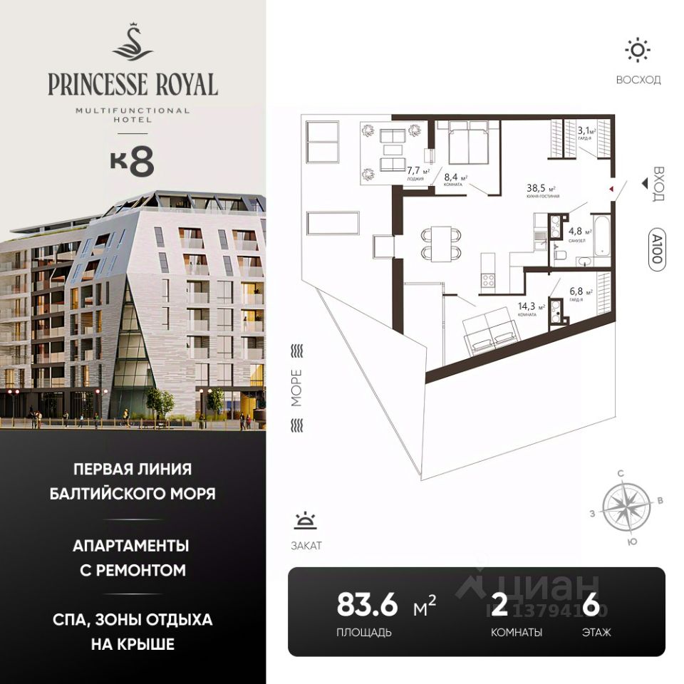 Эксклюзивные апартаменты на первой линии в Зеленоградске Элитный мультифункциональный отель ''PRINCESSE ROYAL'' расположился в курортном Зеленоградске, прямо на променаде Балтийского моря.