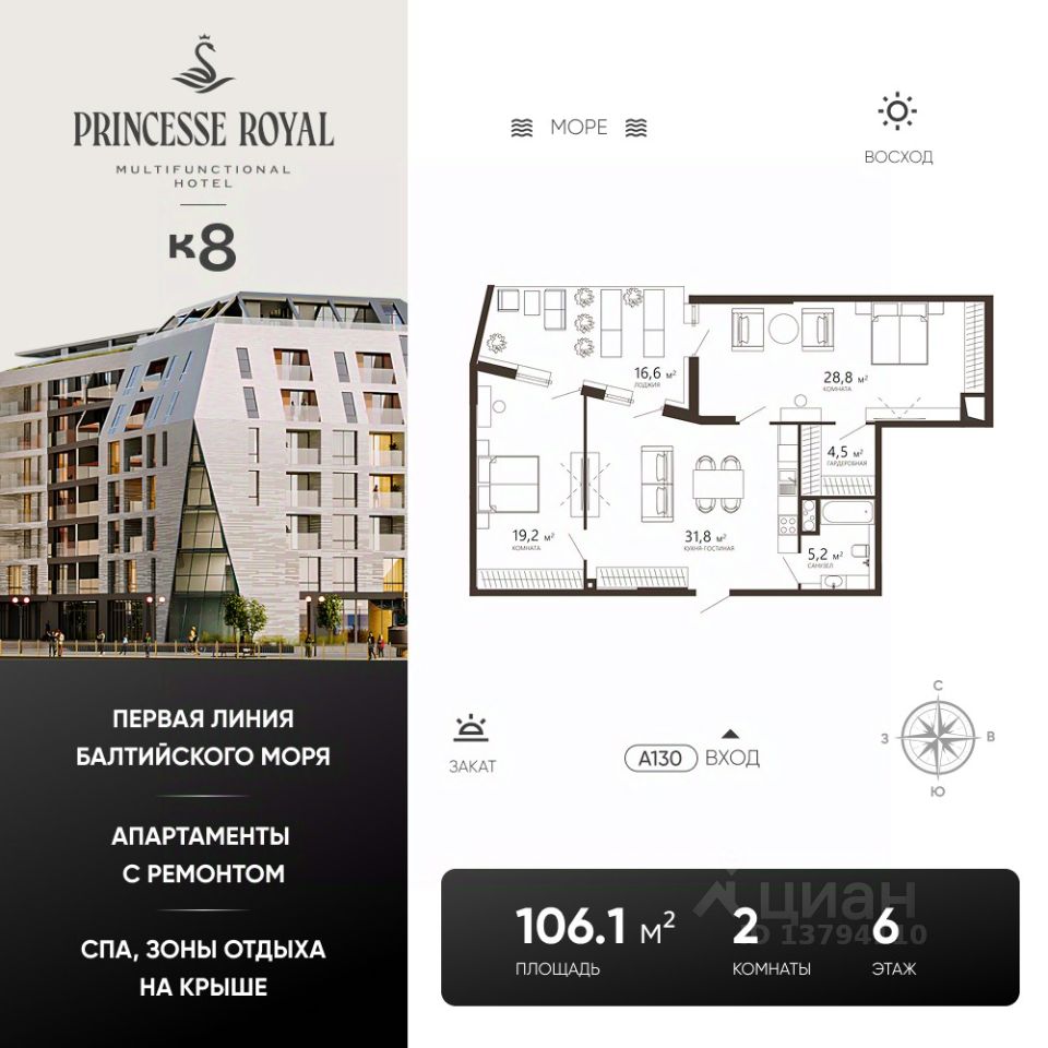 Эксклюзивные апартаменты на первой линии в Зеленоградске Элитный мультифункциональный отель ''PRINCESSE ROYAL'' расположился в курортном Зеленоградске, прямо на променаде Балтийского моря.
