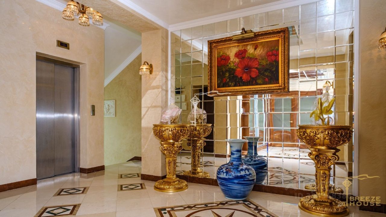 Вся мебель выполнена по индивидуальному заказу в Италии из натурального массива дерева. Интерьер украшен уникальными фресками, скульптурами и картинами, выполненными из мрамора. Для удобства сообщения между этажами, установлен современный лифт ''Otis''.