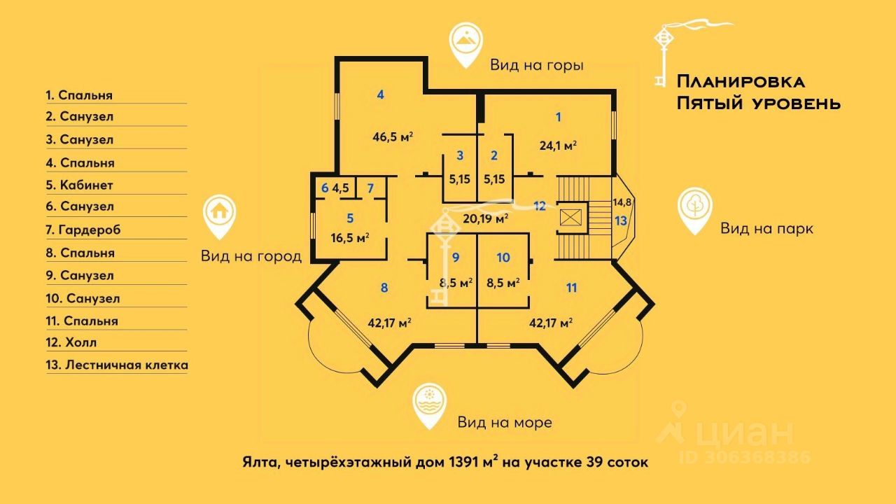 Основной дом площадью 1391 м² включает 12 спален, цокольный этаж с бассейном, тренажёрным залом, первый этаж с сауной и бильярдной, второй этаж с гостиной, столовой и зимним садом, а на третьем и четвертом этажах расположены спальни.