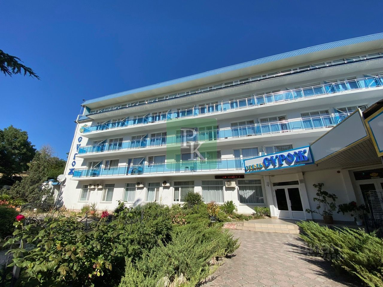 -Республика Крым, г. Судак, ул. Ленина, д. 75, -Площадь комплекса: 2320 м², -Площадь земли: 1000 кв. м. (земля в аренде на 49 лет с 2018 года, можно выкупить за 20 % ), -Высота потолков: 1 этаж - 3.20 м, остальное пространство - 2,5 м, -Этажность: 5, -Готовность объекта: с ремонтом, действующий, -Вход: отдельные входы у кафе, квартиры, так же, на пожарную лестницу с каждого этажа (вход на летнюю площадку кафе, как и центральный вход в гостиницу, располагаются на первой линии ). Технические характеристики: