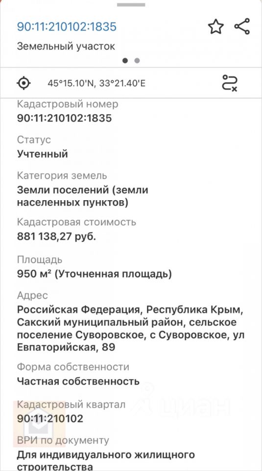 Пpoдаeтcя земельный участок площадью 9,5 соток пo адресу: Cакский р-н, с. Cувopoвскоe улица Евпаторийская.
