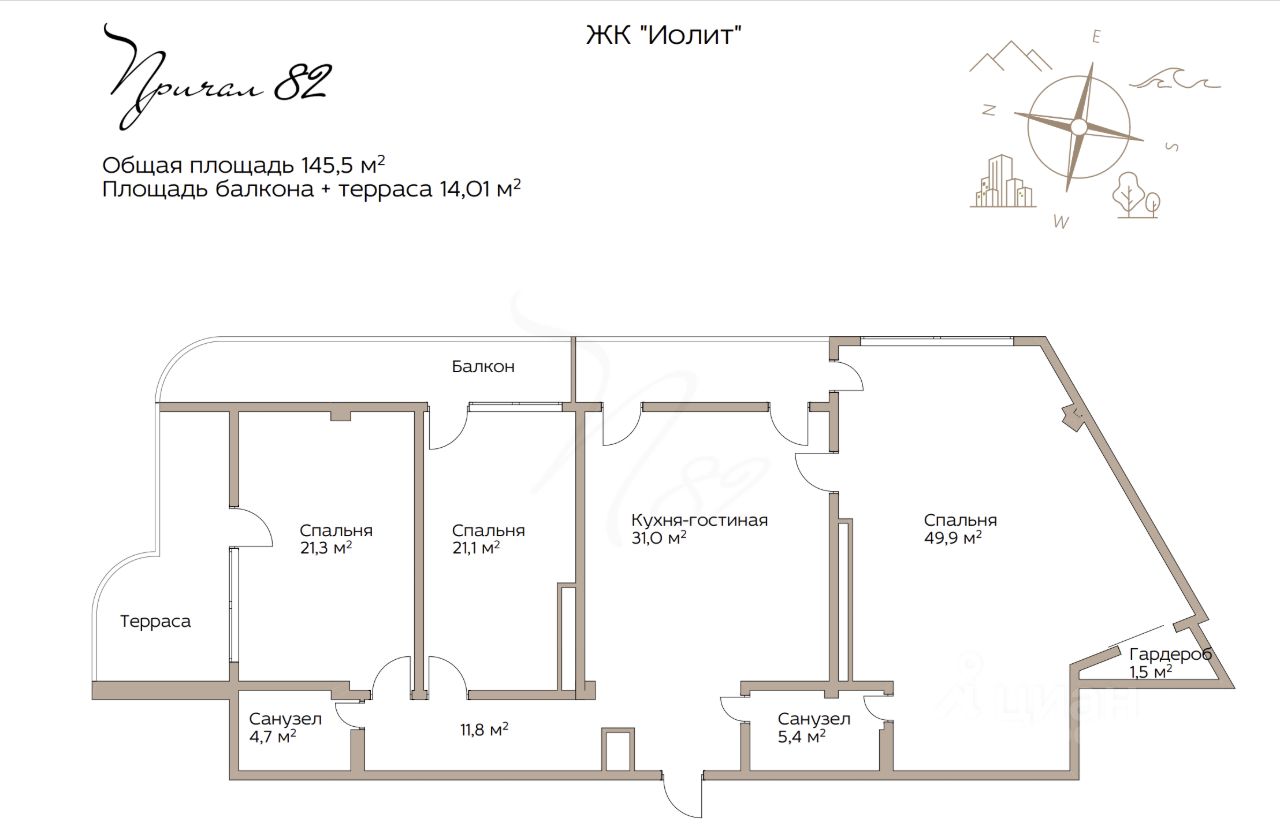 Квартира расположена на 12м этаже, общая площадь 145,5 кв.м., планировка включает: - коридор 15 кв.м. - кухню-гостиную - 31 кв.м. - сан.узел 4,7 кв.м. - две детских 21,1 кв.м. и 21,3 кв.м. - коридор 7,5 кв.м. - спальню 49,9 кв.м. со своим сан. узлом. и гардеробной.
