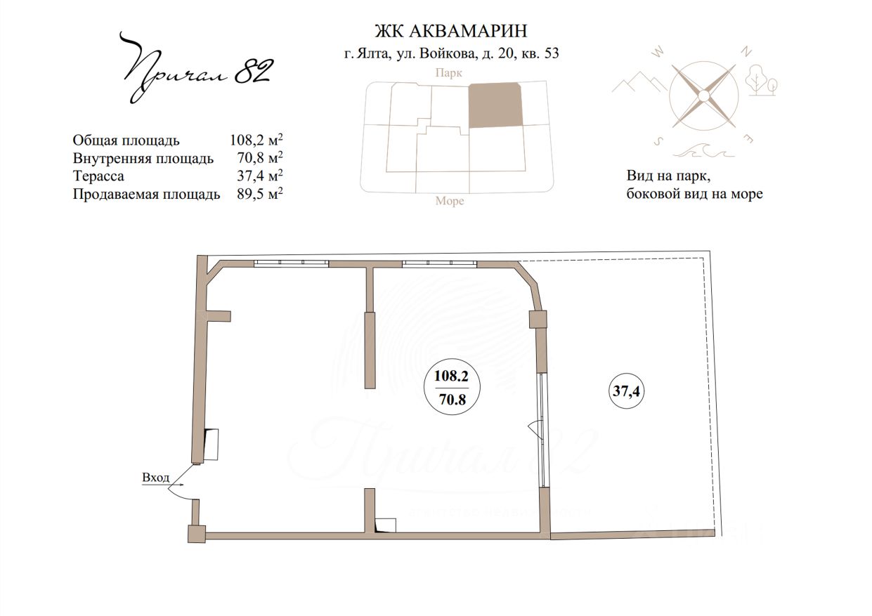 Квартира в ЖК Аквамарин, общей площадью 89,8 кв.м, расположена на 8 этаже 8-ми этажного комплекса. Квартира свободной планировки с высокими потолками 3.40 и большой террасой 37,9 кв.м., которая позволяет наслаждаться морскими и горными пейзажами Ялты. Большая терраса при желании может быть приспособлена для размещения площадки для занятий спортом, отдыха, соляриев, озеленения и других хозяйственных целей. ЖК Аквамарин это новый сданный в эксплуатацию комплекс комфорт класса в самом сердце Ялты. Главной его особенностью является месторасположение и завораживающий вид на море и Ялту .Комплекс находится одновременно в центре города и на границе с парком. Благодаря тому, что жилой комплекс расположен на возвышенности, из окон квартир открывается панорамный вид на Чёрное море, великолепную Ялту и зеленый парк!