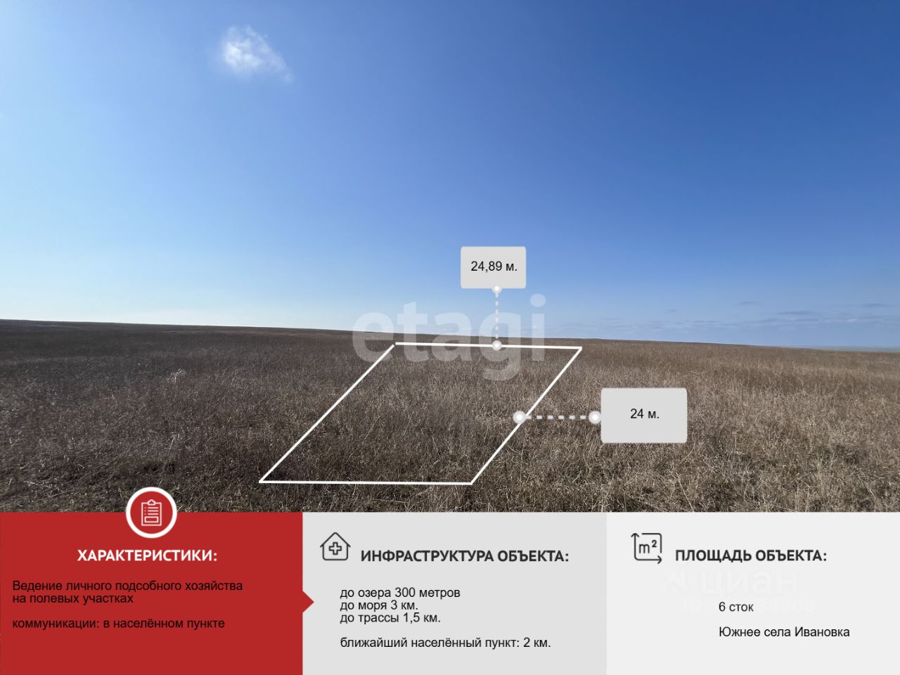 Участок правильной квадратной формы, находится в 400 метрах от живописного озера Кизил Яр, отличный вариант для любителей рыбалки и выращивания сельхоз культур.