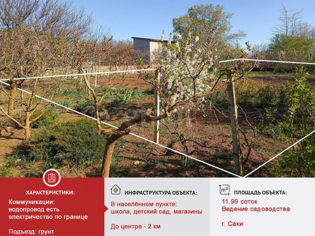 Продаётся земельный участок в г. Саки, ТСН ''СНТ Химик-1''. Общая площадь - 1199 кв.м. Участок ровный, ухоженный, посажен плодовый сад. Участок расположен в 3 км от моря в тихом спокойном районе города. Электрический столб рядом с участком, водопровод заведен, газ ожидается. Остановка общественного транспорта, школа, детский сад - в шаговой доступности. Категория: земли поселений. Вид разрешенного использования: ведение садоводства. Полный пакет документов, границы участка уточнены, право собственности РФ. Наша комиссия 79000 р.+1% от стоимости объекта, но не менее 70000 р.