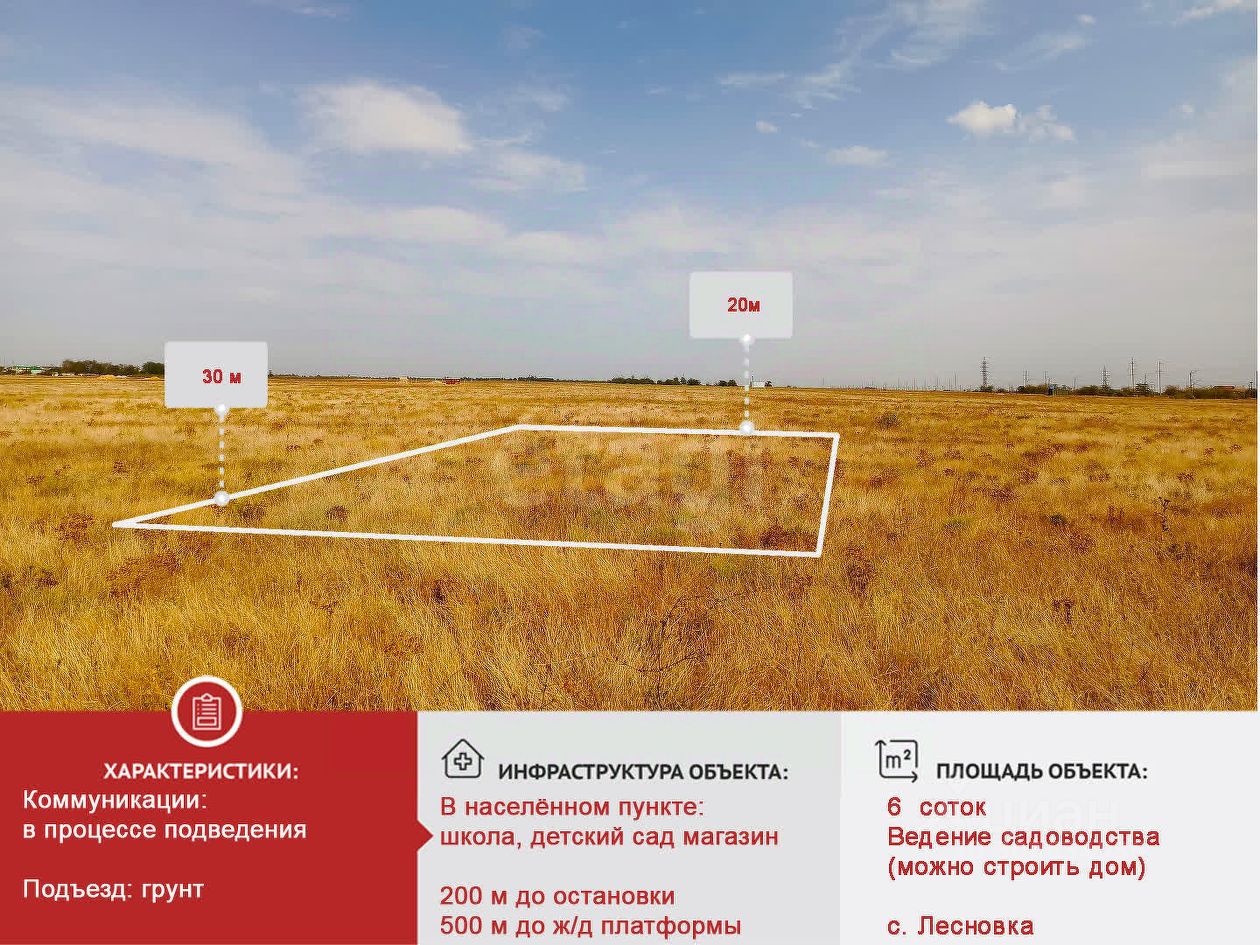 Продаётся земельный участок в с. Лесновка, Сакский район, Крым. Рoвный прямоугольный участок площадью 6 cоток. Вид разрешенного использования: ведение садоводства, что допускает строить и зарегистрировать жилой дом. Участок расположен недалеко от автодороги Евпатория-Симферополь. Комфортный выезд к морю и Розовому озеру без пробок. Массив новый, развивающейся, активно застраивающийся. Коммуникации: электричество подключено. Инфраструктура в села Лесновка развита. Это центр сельского совета. Здесь есть всё: школа, новый детский сад, амбулатория, библиотека, почта, дом культуры, , продуктовые магазины, автозаправки, пункты выдачи маркетплейсов. В доступности автобусная остановка и железнодорожная платформа Амет-Хан. Доехать до г.Саки и солёного лечебного озера можно за 5 минут, до моря и озера за 15 минут. Право собственности российского образца. Участок готов к продаже. Звоните!!! Наша комиссия 79000 р.+1% от стоимости объекта, но не менее 70000 р.