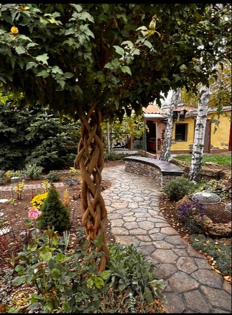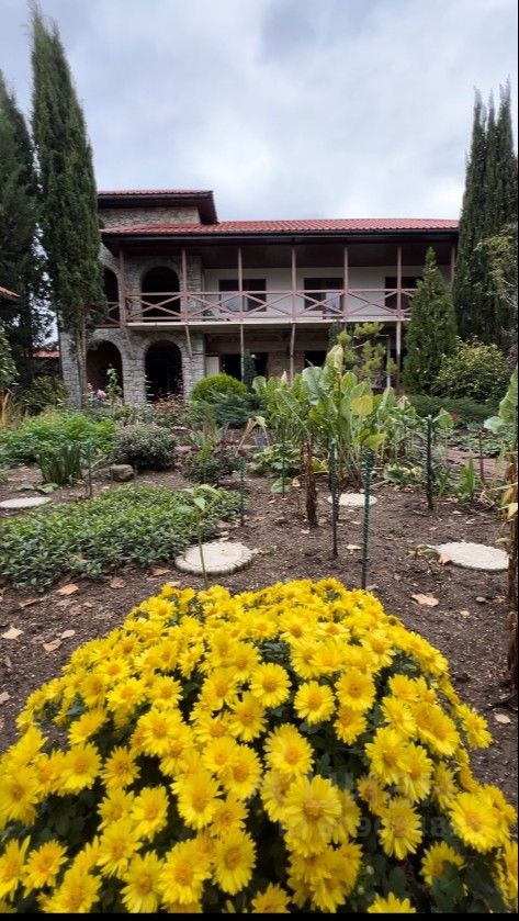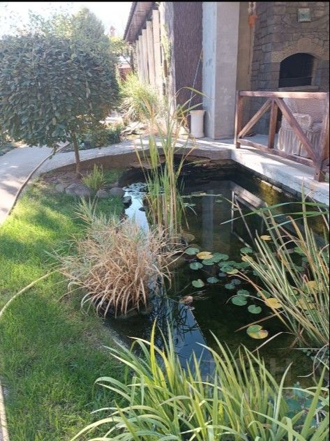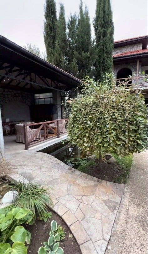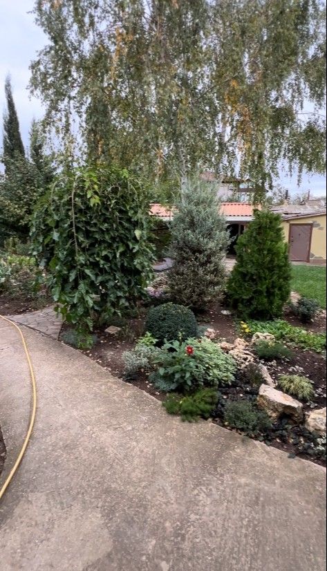 На территории участка высажены многолетние деревья и выполнен продуманный ландшафтный дизайн. Много хвойных растений: туи, кипарисы, тис, ели, можжевельник, а также березы, шелковица, разные цветы, альпийские горки, декоративные лавочки. Все делалось с любовью и для себя. Есть беседка с камином и зоной отдыха. Предусмотрено место для парковки трех машин. Есть сарай и гараж
