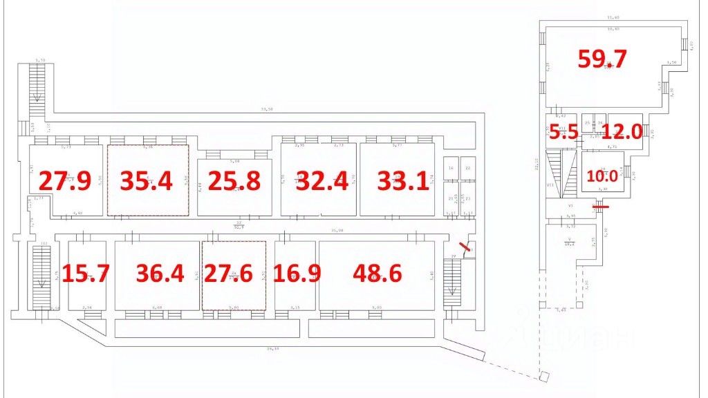 Комплекс из двух автономных частей 400 и 100 кв.м., коридорная система, 12 кабинетов от 15 до 60 кв.м.,