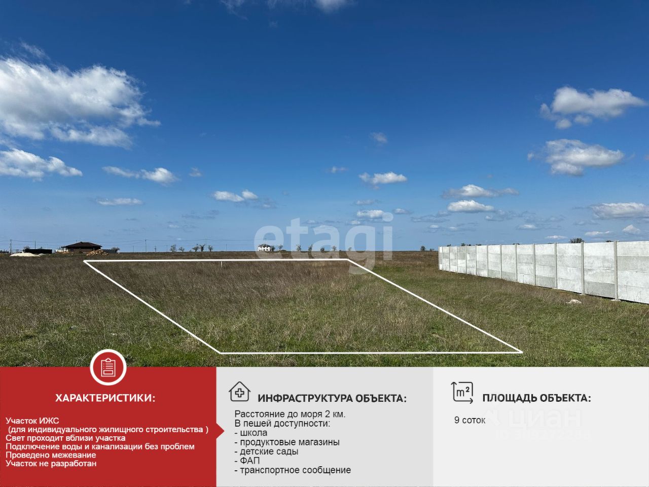 Продается земельный участок в пригороде г. Евпатория в п. Уютное. Земельный участок правильной прямоугольной формы. Расположение отличное 2 участок от угла дороги. На данный момент уже есть два подъезда к участку. До моря 10 мин на машине. Рядом идет активное строительство. В поселке развита инфраструктура: магазины, детский садик, школа и т.д. Все есть для комфортной жизни. Назначение земли для индивидуального жилищного строительства. Коммуникации: электричество, можно протянуть с ул. Степная, если немного подождать то можно будет подключится рядом с участком (оставлена заявка в Крымэнерго), вода по периметру можно подключится, но качество воды на низком уровне, лучше пробивать скважину 14-18 метров. Документы РФ. Готовы к сделки. Звоните.