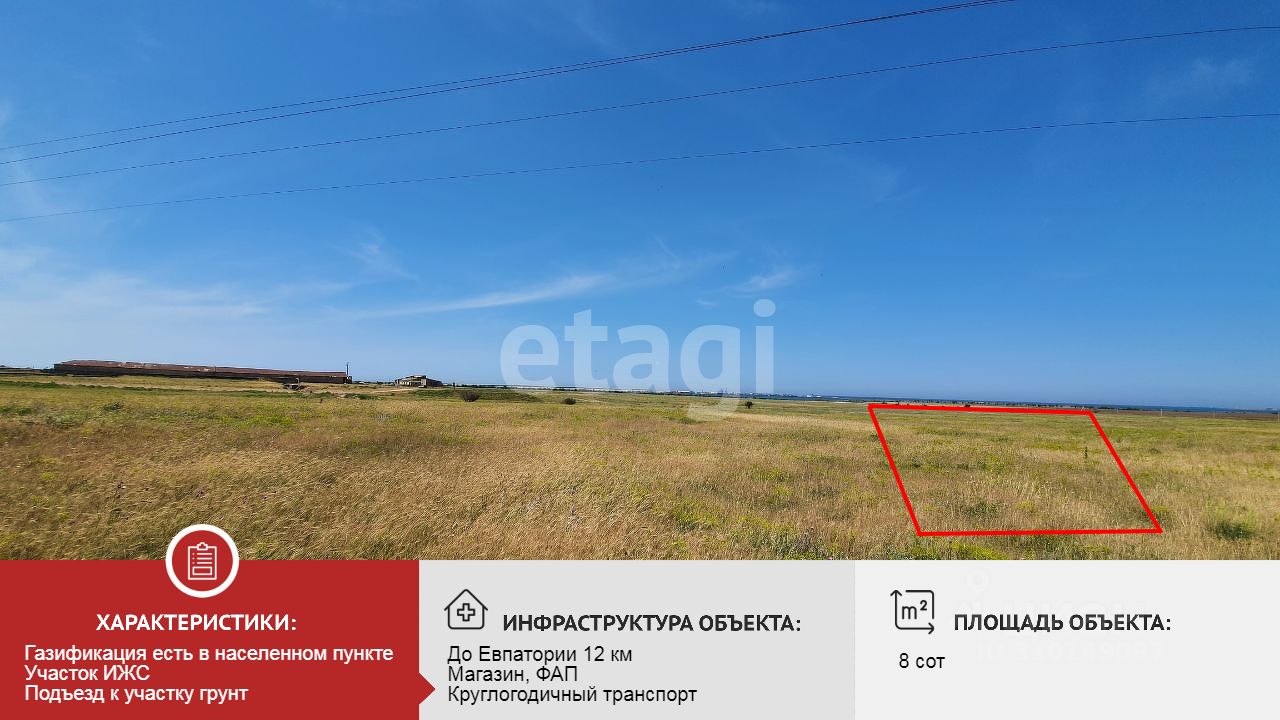 Уникальное предложение! Продается участок 8 соток в живописном селе Великое, всего в 10 км от курортного города Евпатории. Это идеальное место для строительства вашего загородного дома или коттеджа!