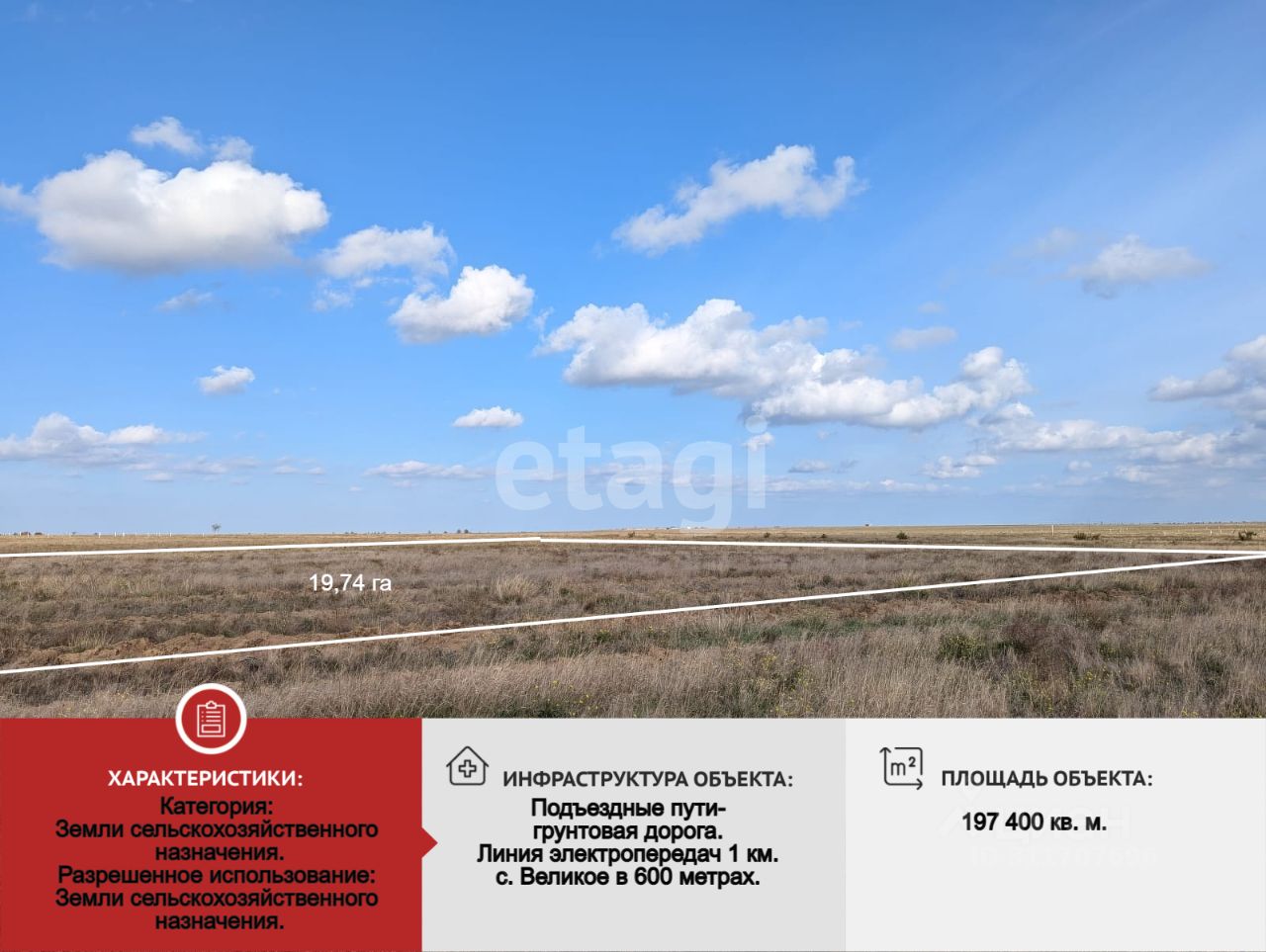 Категория: земли сельскохозяйственного назначения. Разрешенное использование: земли сельскохозяйственного назначения.Участок с ровным рельефом, пригоден для посадки сада и ведения фермерского хозяйства. Отлично просматриваемое место. Подъезд к участку по грунтовой дороге. До линии электропередач 1 км. Для воды нужно бить скважину (50-60 м.).