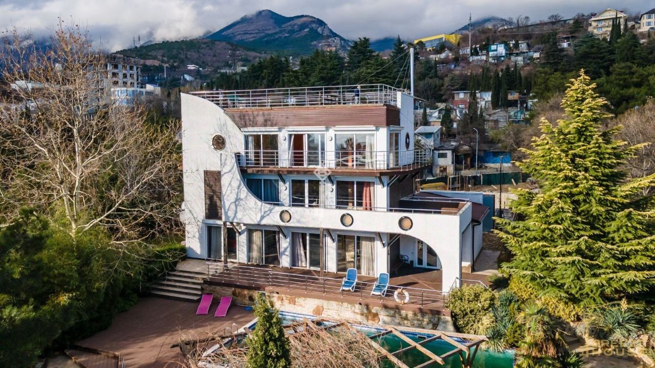 Продажа 3-этажной виллы с дизайнерским ремонтом и панорамным остеклением в пол на участке 10 соток с бассейном и потрясающим видом на море, горы и Ялту.