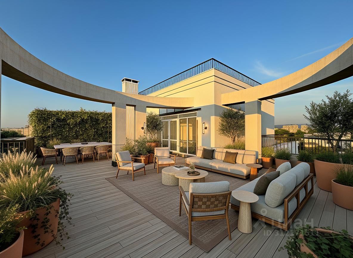 На первом этаже располагается кухня - гостиная, две спальные комнаты и два санузла. Из всех комнат на первом этаже выход на большой круговой балкон. На втором этаже кабинет/спальная комната/комната отдыха. Со второго этажа прямой выход на эксплуатируемую кровлю.