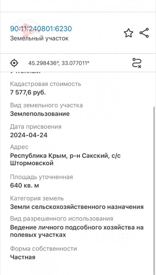 Продаётся участок 6,5 соток. Сельхозназначения в селе Крыловка, Сакского района.