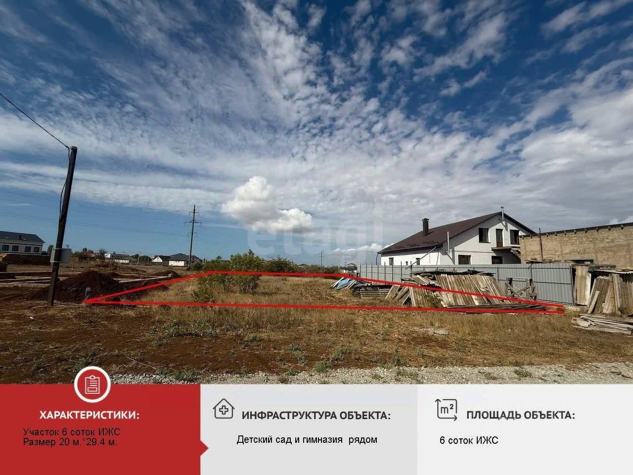 Продаётся участок, расположенный в новом жилом активно застраивающемся районе г. Саки Крым. Вид разрешенного использования: для индивидуального жилищного строительства. Общая площадь участка 600 м.кв. Все коммуникации доступны для подключения. В этом районе люди живут круглогодично. В ближайшем доступе современная детская площадка. До автобусной остановки - 200 м. До станции железно-дорожного сообщения - 300м. В пешей доступности магазины, школа, детский сад - 700 м. Удобный выезд на дорогу, ведущую до моря или в сторону г. Саки, г. Симферополь, г. Севастополь. Успейте построить дом своей мечты) Документы готовы к продаже. Звоните! Наша комиссия 59000 р.+1% от стоимости объекта, но не менее 70000 р.