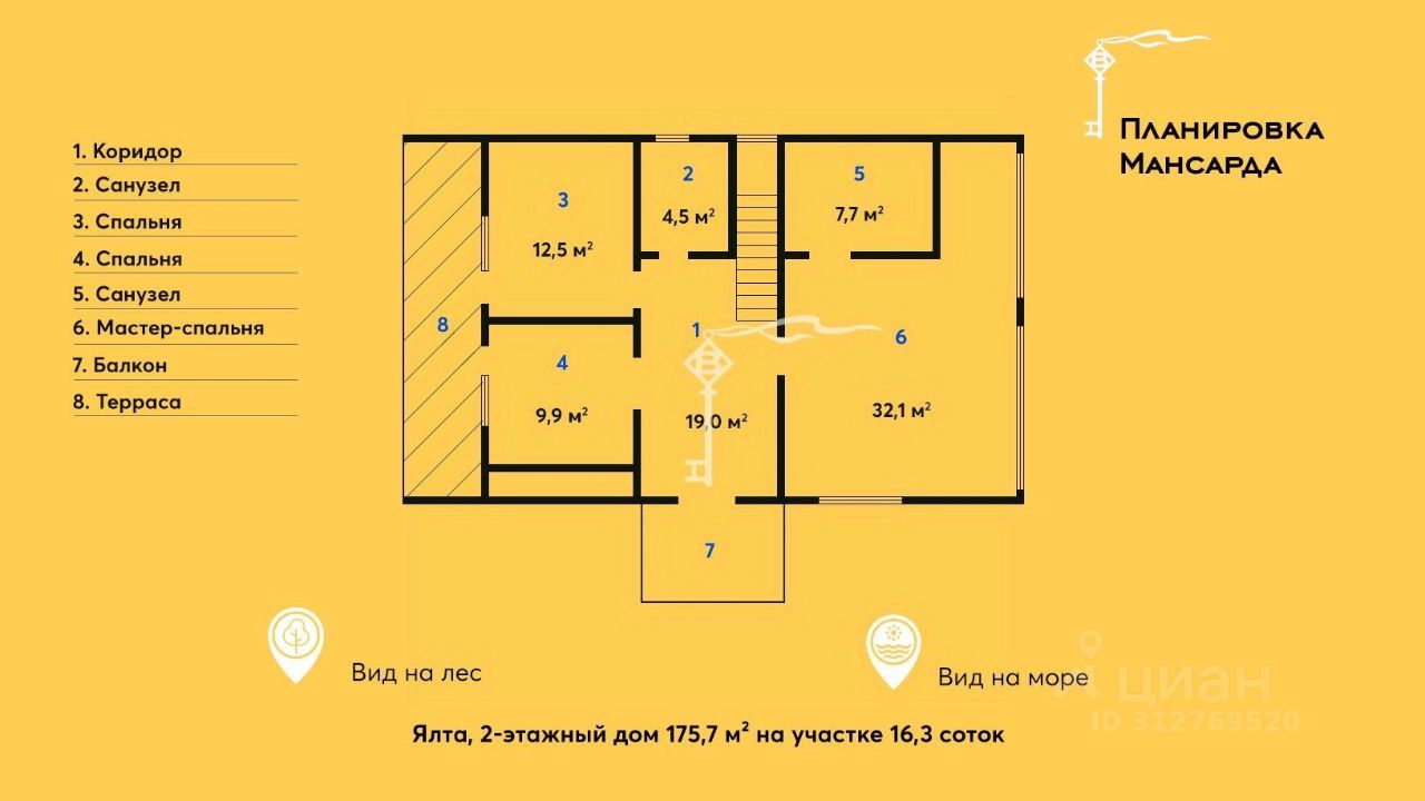 Двухэтажный дом площадью 175,7 м² расположен в привилегированном районе - престижной локации Большой Ялты, поселке Отрадное.