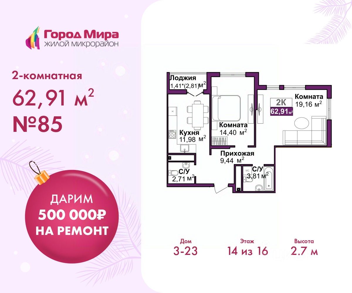 2-комн. квартира с предчистовой отделкой в ЖМ ''Город Мира'' на 14 этаже. Общая площадь: 62.91 кв.м., жилая: 33.56 кв.м., площадь просторной кухни-столовой: 11.98 кв.м. Квартира угловая, идеально подойдет любителям тишины и панорамных видов. В квартире одна лоджия, один совмещенный и один раздельный санузел. Высота потолков 2.7 м.