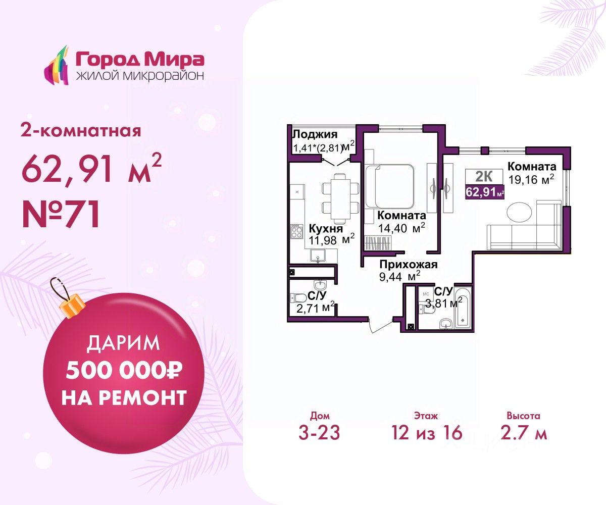 2-комн. квартира от застройщика с предчистовой отделкой в ЖМ ''Город Мира'' на 12 этаже. Общая площадь: 62.91 кв.м., жилая: 33.56 кв.м., площадь просторной кухни-столовой: 11.98 кв.м. Угловая квартира, очень светлая, естественная вентиляция при открытии окон. В квартире одна лоджия, один совмещенный и один раздельный санузел. Высота потолков 2.7 м.