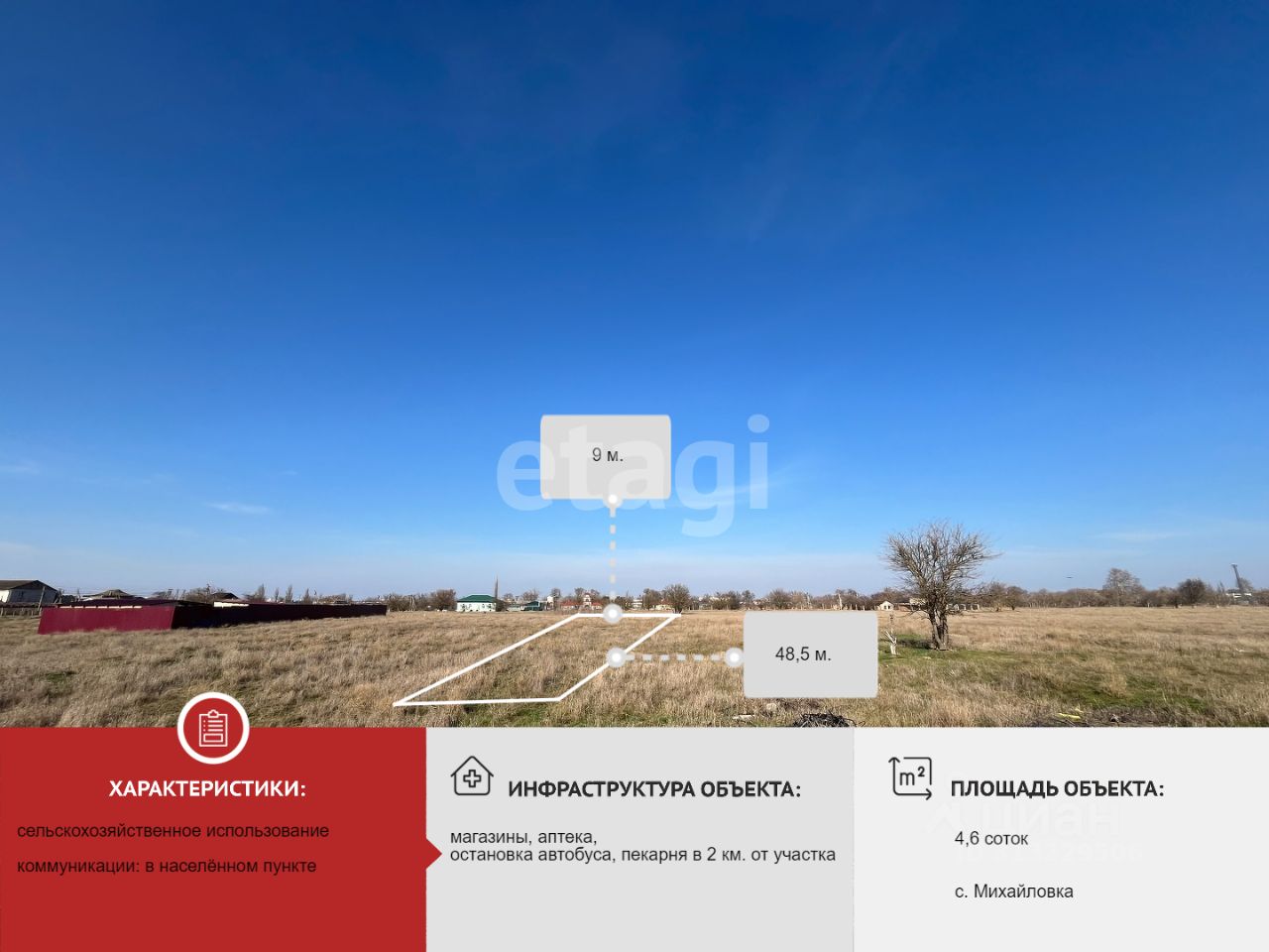 Участок правильной формы, ровный (подходит для сельскохозяйственных культур) свободен от построек и насаждений, находится в непосредственной близости с насёлённым пунктом, подъезд к участку удобный.