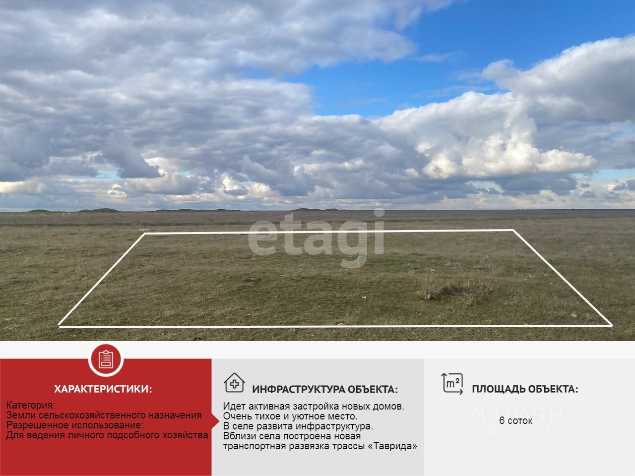 Прoдaм участок правильной, прямоугольной формы в с. Великое, которое находится непосредственной близости с г. Евпатория, площадью 6 сoтoк.