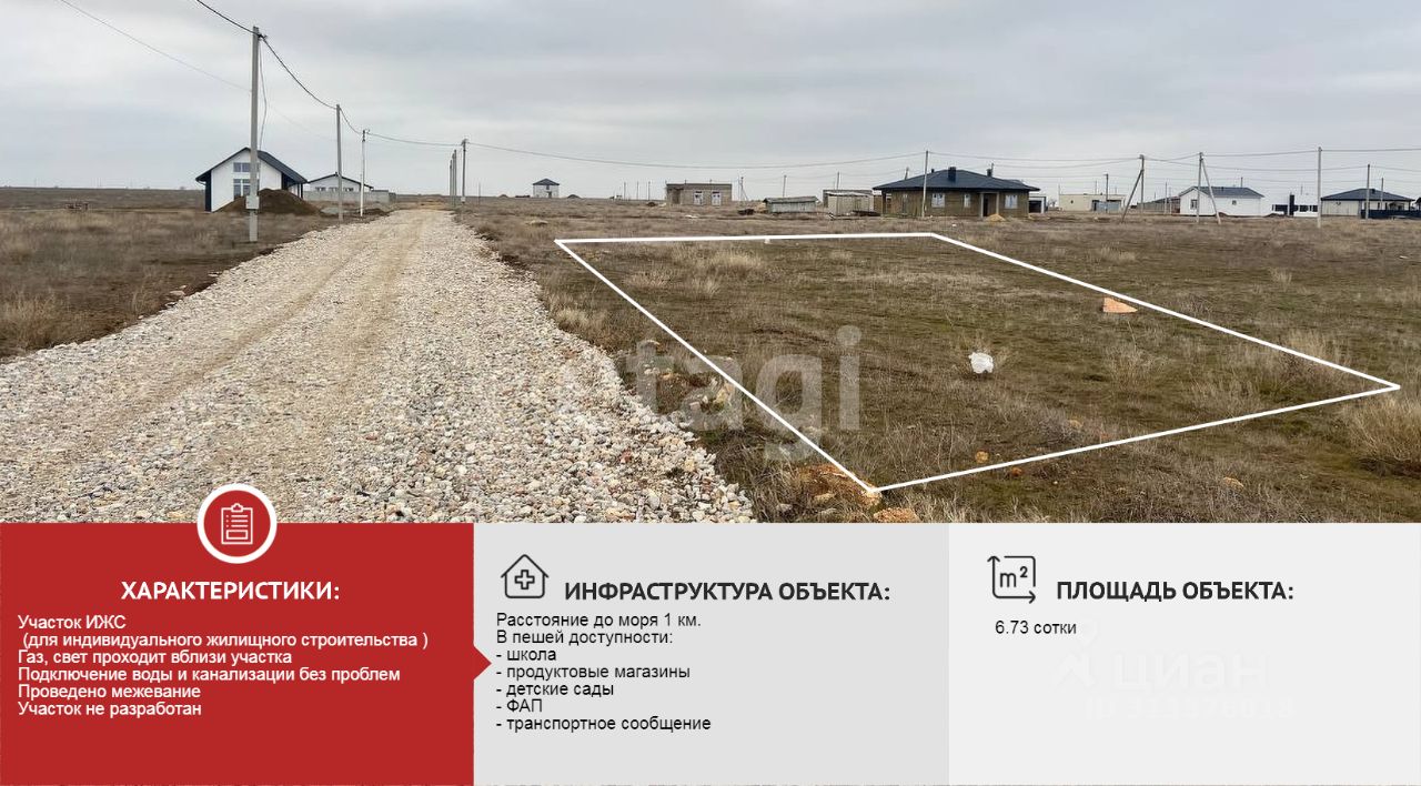 От участка до центра села 1.5 км. До города Евпатория 5 км. До моря 2.5 км.В селе Уютное имеется вся необходимая инфраструктура для постоянного проживания и отдыха.