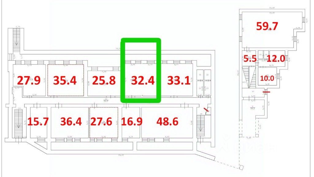 Кроме обозначенного помещения в продаже есть кабинеты от 16 до 38 кв.м. и отдельное помещение 100 кв.м. ( за 9 млн) , возможно приобретение всго комплекса (500 кв.м.) целиком за 35 млн. В комплексе коридорная система, 12 кабинетов от 15 до 60 кв.м. Часть помещений сдается в аренду (500 р за кв.м.), можно переуступить договор аренды новому собственнику.