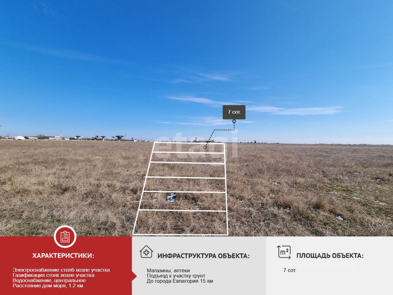 Продается уникальный участок 7 соток, ведение дачного хозяйства, в Молочненское сельское поселение, Сакский район, Республика Крым рядом с Евпаторией, ровный, недалеко от моря.