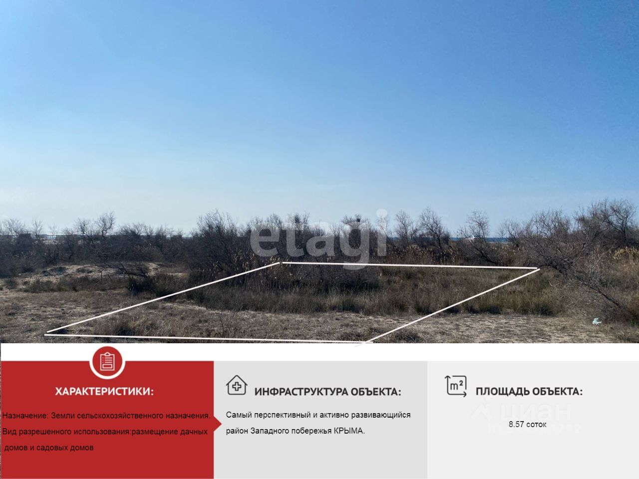 До города Евпатории 25 км. Назначение: Земли сельскохозяйственного назначения. Вид разрешенного использования:размещение дачных домов и садовых домов. Участок ровный, правильной прямоугольной формы. Рядом с участком проходят коммуникации. Земельный участок расположен на песчаной косе между озером Донузлав и Черным морем с чистейшим белым песком. До моря 100 метров. Прозрачная, чистая морская вода не оставит вас равнодушными и будет радовать каждый день пребывания. Отличное место для собственного отдыха, доходного бизнеса, так же инвестиций. Самый перспективный и активно развивающийся район Западного побережья КРЫМА. Право собственности зарегистрировано в РФ.