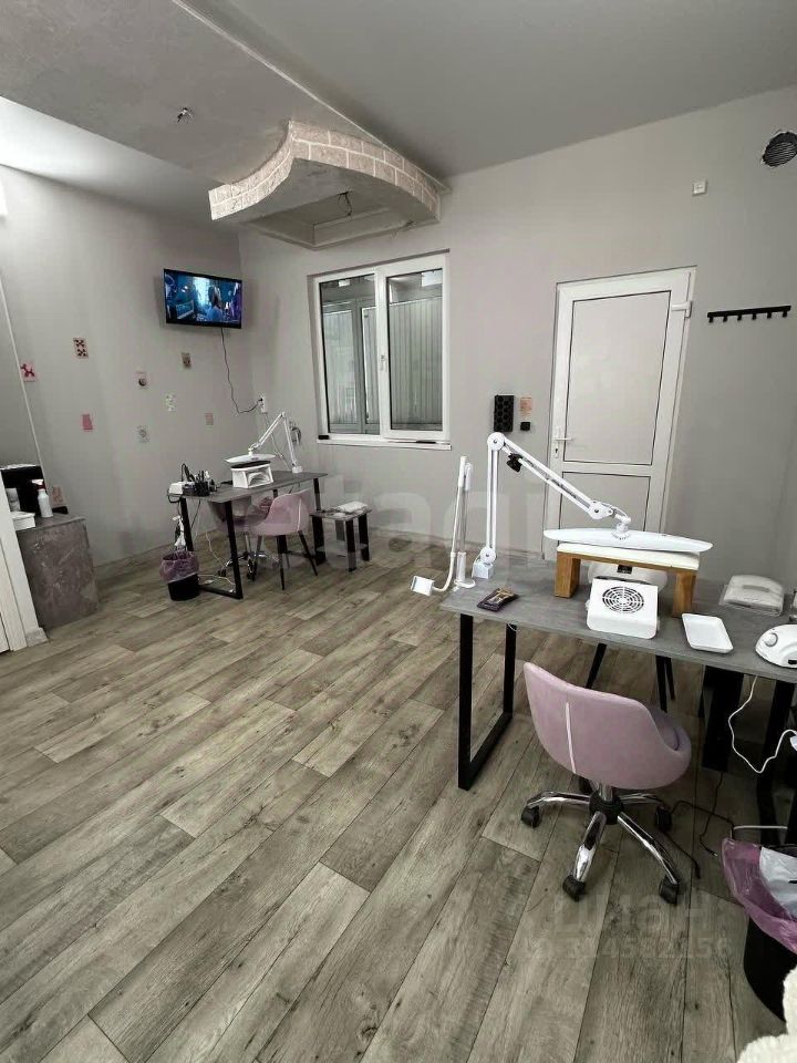 Пустое помещение, вода и свет есть, стеклянные двери, есть отдельное помещение с санузлом и раковиной, положен плинтус на пол, покрашеные стены в бело-розовый цвет, видное место, мебель остается по договорености.