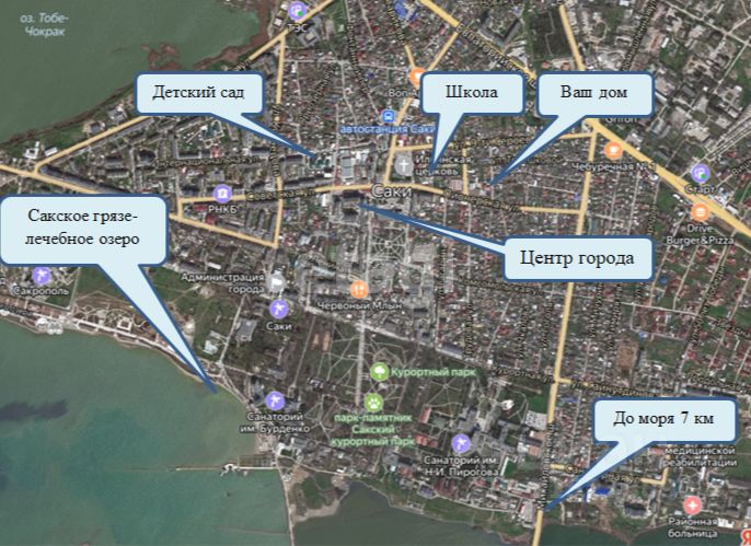 В шаговой доступности находятся: центр города, площадь, санатории, лечебное озеро, грязи, поликлиника, магазины, аптеки и школа. А до моря всего 5 километров — 10 минут на машине, и вы уже на берегу!