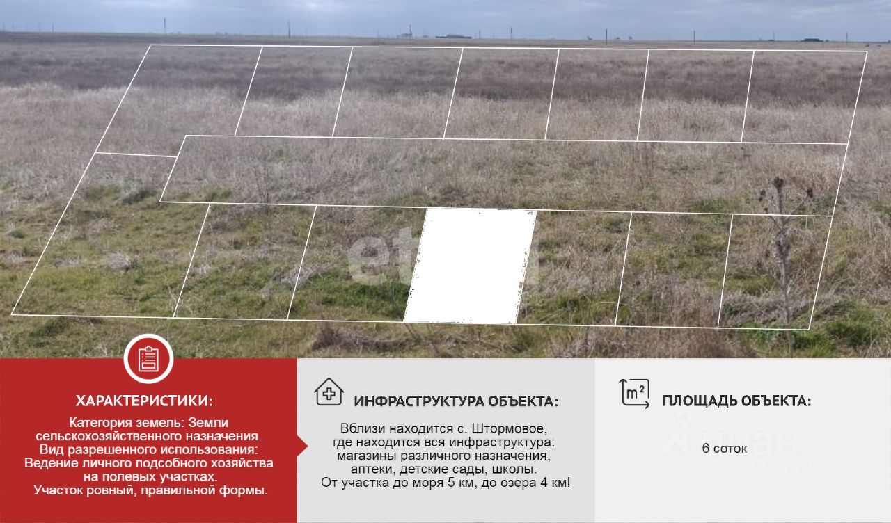 Вблизи находится с. Штормовое, где находится вся инфраструктура: магазины различного назначения, аптеки, детские сады, школы. От участка до моря 5 км, до озера 4 км!