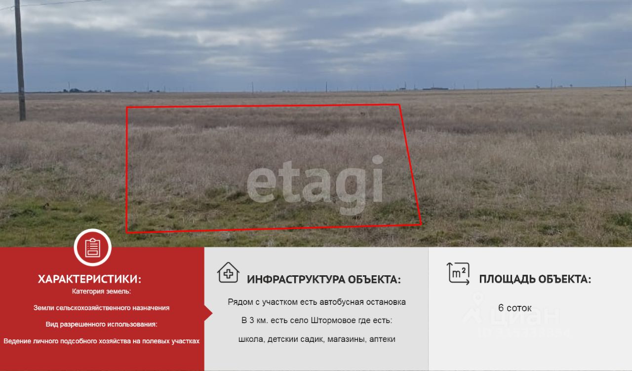 Продается участок площадью 6 соток, в 3 км. село Штормовое.