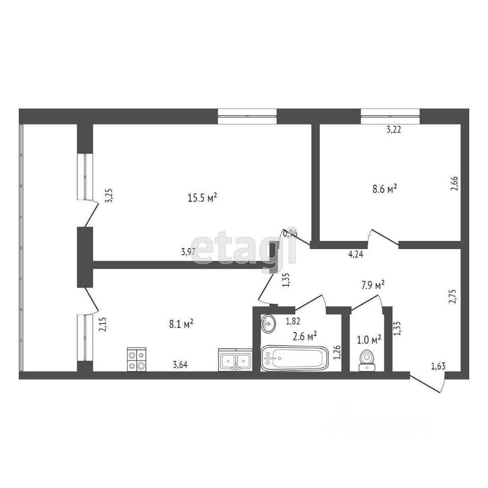 Квартира состоит из прихожей 7.9 кв. м, двух изолированных комнат 15.5 и 8.6 кв. м, застеклённой лоджии 0.7 кв. м, кухни 8.1 кв. м, раздельного санузла 1.6+1 кв. м.
