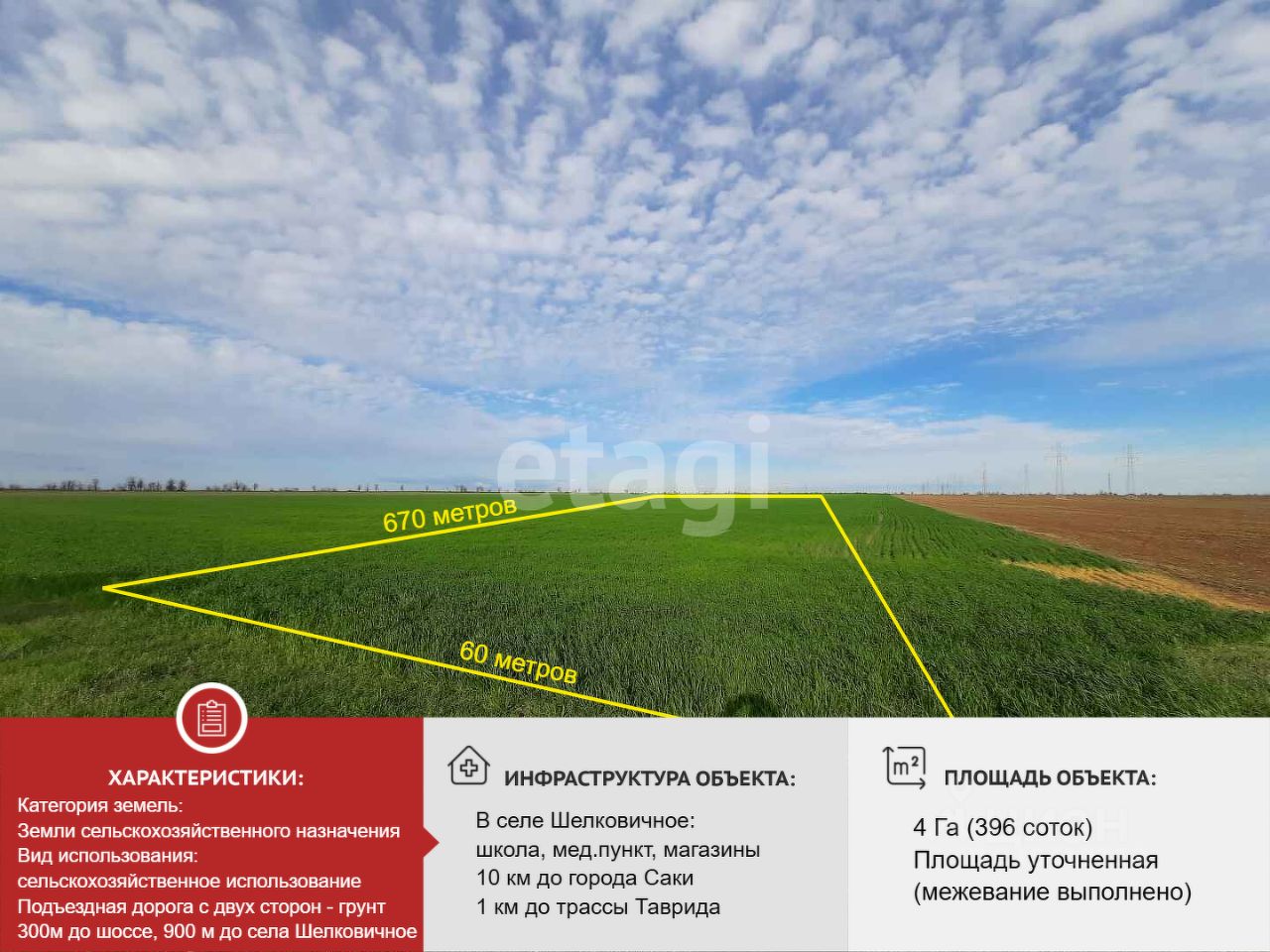 Продается земельный участок сельхозназначения, площадь 4 Га (396 соток). Участок расположен в 900 метрах от села Шелковичное.