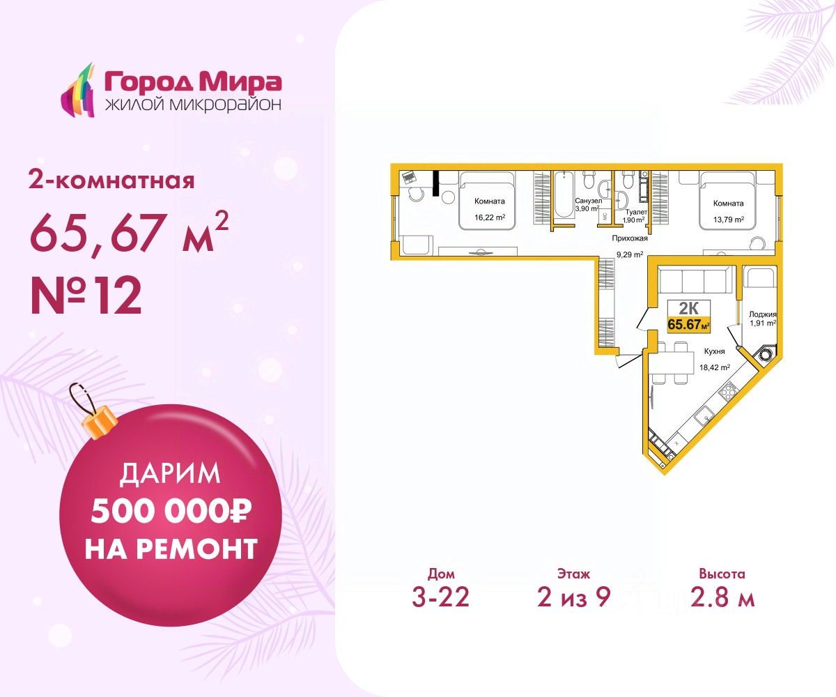 Просторная 2-комн. квартира с предчистовой отделкой в ЖМ ''Город Мира'' на 2 этаже. Общая площадь: 65.67 кв.м., жилая: 30.01 кв.м., площадь просторной кухни-столовой: 18.42 кв.м. Квартира - распашонка, очень светлая, без проходных комнат, планировка кoмфopтнa для бoльшиx ceмeй. В квартире одна лоджия, один совмещенный и один раздельный санузел. Высота потолков 2.8 м.