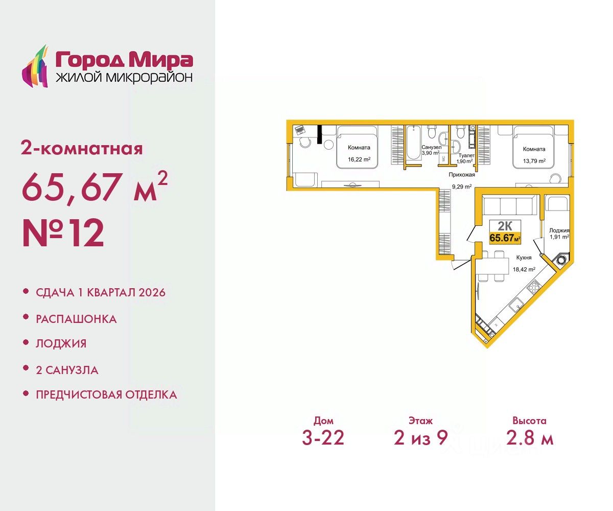 2-комн. квартира с предчистовой отделкой в ЖМ ''Город Мира'' на 2 этаже. Общая площадь: 65.67 кв.м., жилая: 30.01 кв.м., площадь просторной кухни-столовой: 18.42 кв.м. Квартира - распашонка, без проходных комнат, окна выходят на paзные стороны дома. В квартире одна лоджия, один совмещенный и один раздельный санузел. Высота потолков 2.8 м.